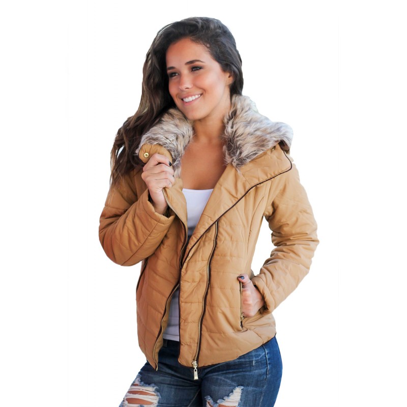 | Product Name | Camel Faux Fur Collar Trim Black Quilted Jacket |