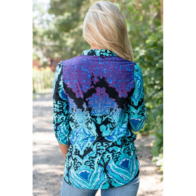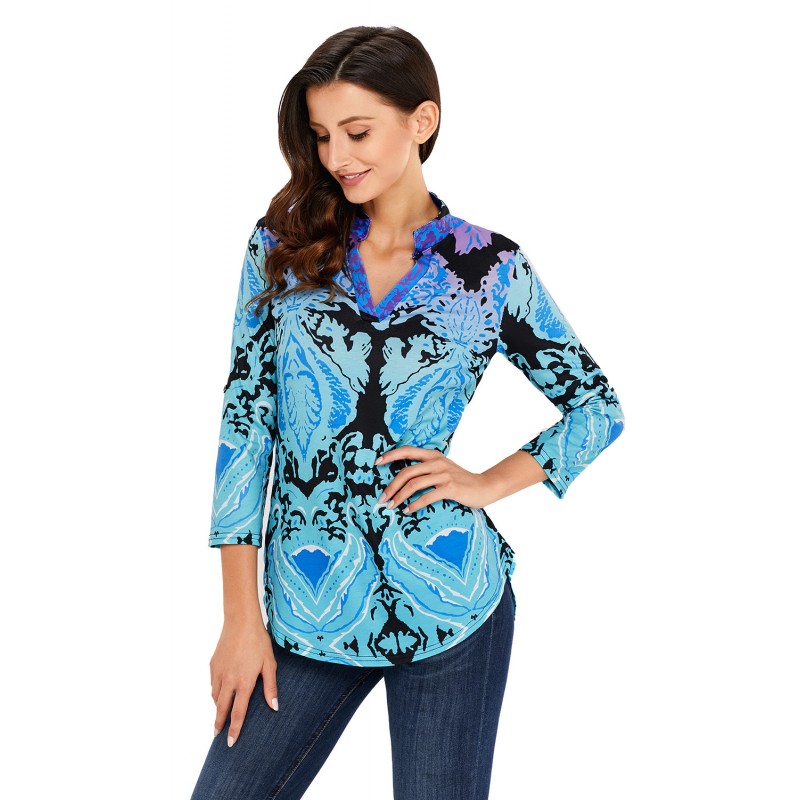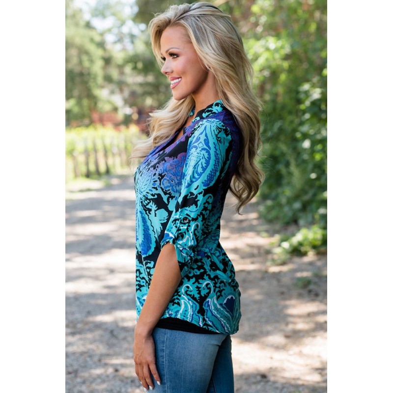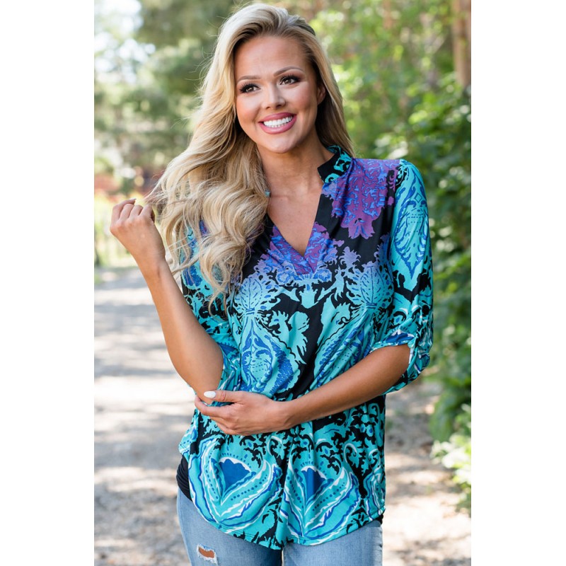 | Product Name | Turquoise Easily Obsessed Damask Print Split V Neck Tunic |